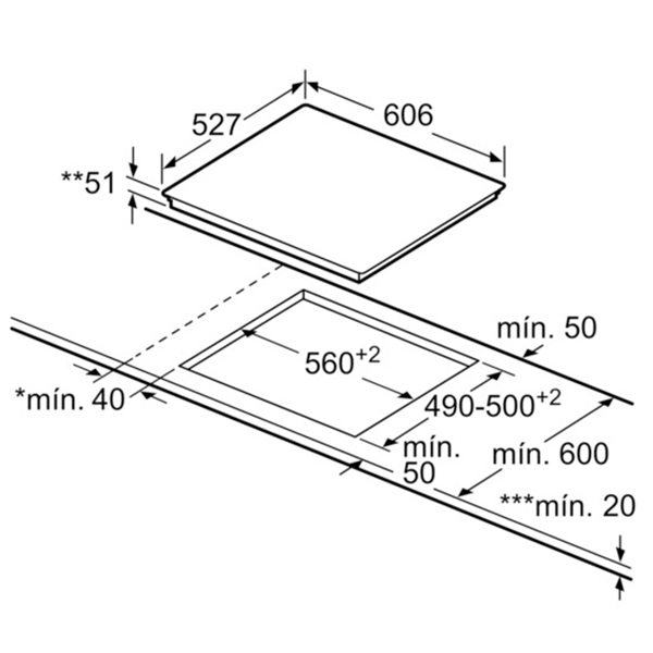 – Kích thước lắp đặt (CxRxD) : 51 x 490-500 x 560-560 mm