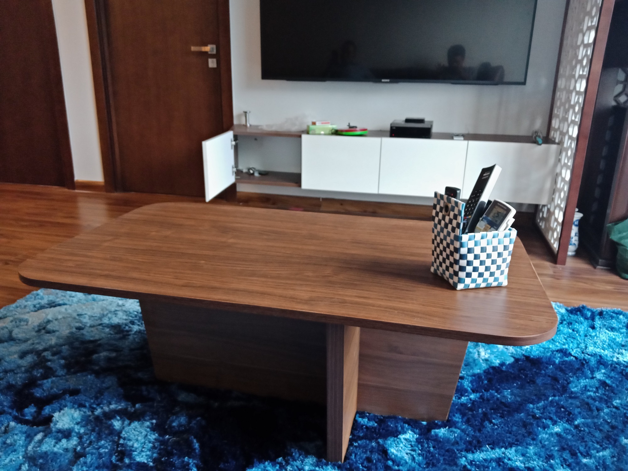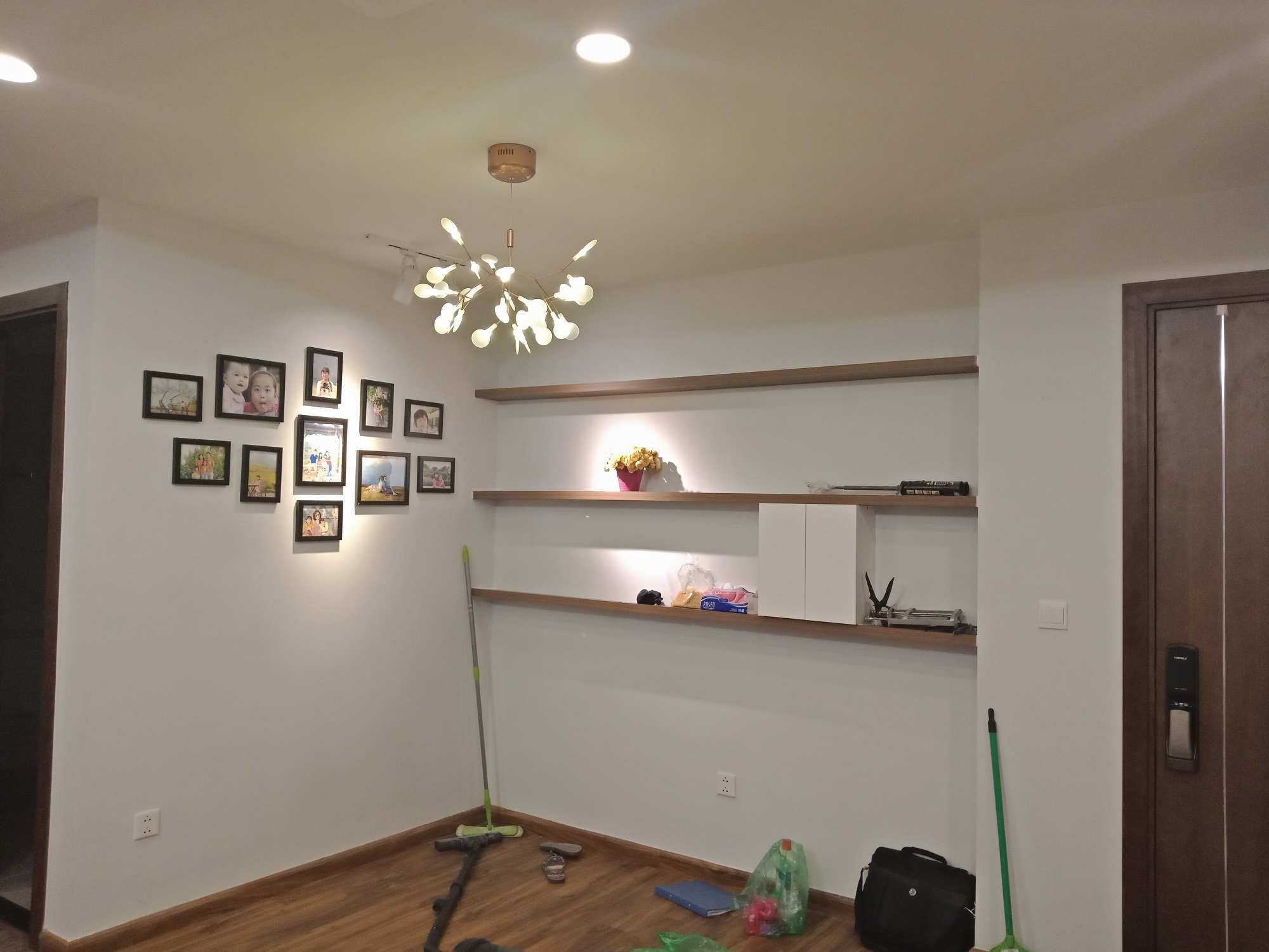 Kiến trúc sư thiết kế tủ trang trí với nhiều hệ thống ngăn kéo hướng tới sự nhẹ nhàng, ngăn nắp và tiện nghi. Ti vi treo tường, đợt trang trí gắn tường là phương pháp được nhiều kiến trúc sư lựa chọn cho căn hộ có diện tích nhỏ. Với những bức hình kỉ niệm của gia đình, tràn đầy tình yêu thương, gắn bó, đây cũng là giây phút ngẫu hứng của Chị chủ nhà tạo nhấn nhá và hút mắt với vẻ đẹp của góc bàn ăn.